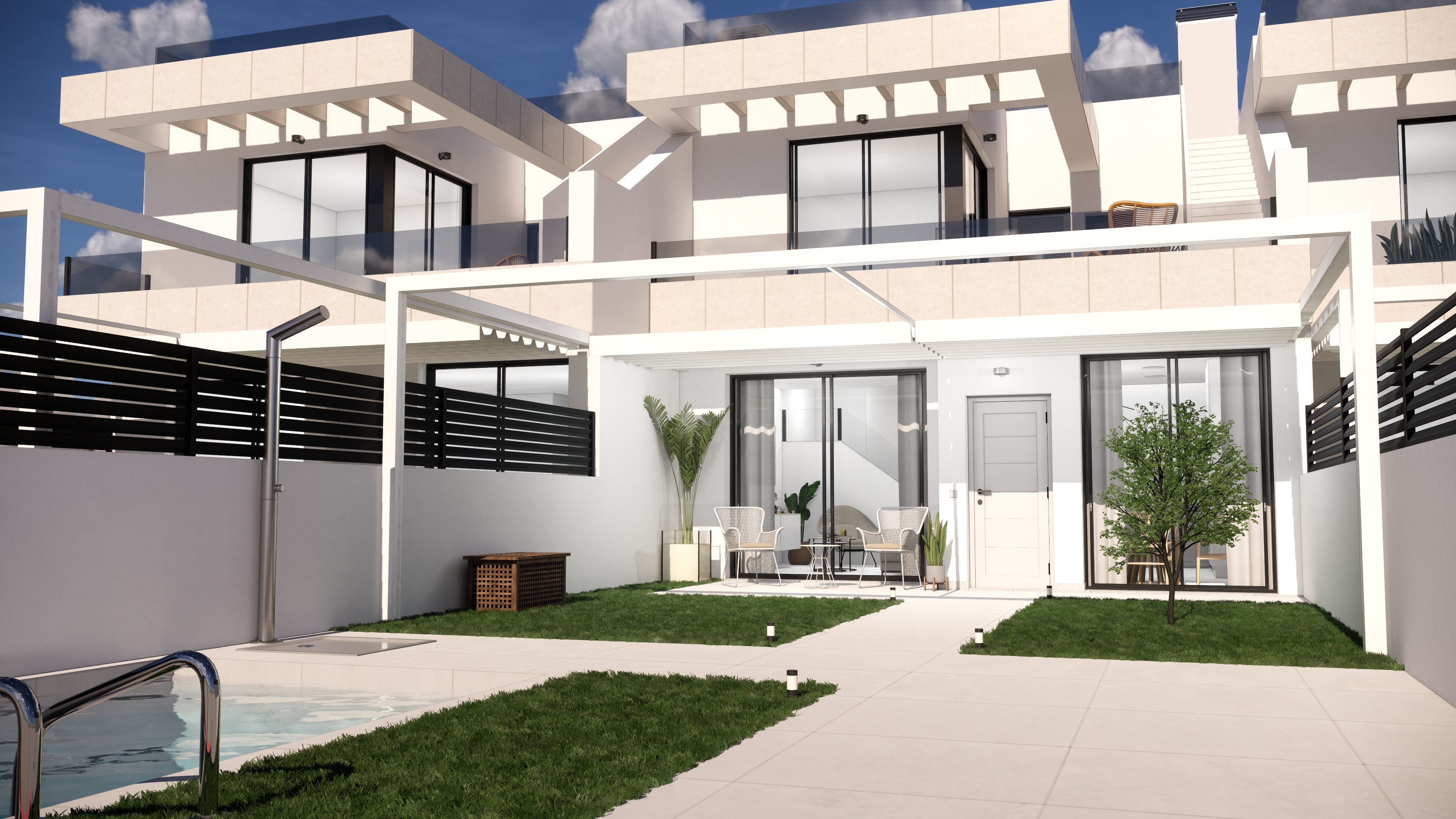 Experience the luxury of these stunning townhouses that span three levels. The ground floor showcases an open-plan kitchen, living, and dining area, complemented by a suite and a guest bathroom. On the first floor, two en-suite bedrooms await, with one granting access to a spacious terrace exceeding 18 square meters. The crowning feature is an optional solarium, nearly 50 square meters in size. Additionally, the option for a private pool enhances the property. The villas come exceptionally well-equipped, with pre-installed air conditioning throughout. The kitchen boasts both upper and lower cabinets and is fully equipped with integrated appliances including a fridge, extractor fan, oven, hob, washing machine, and dishwasher. Bedrooms are fitted with built-in wardrobes complete with drawers, while the bathrooms include underfloor heating, shower screens, and a vanity unit with a mirror. Situated in Rojales, these properties provide a perfect balance of leisure activities and essential services, all within easy reach. Enjoy the proximity to the center of Torrevieja or Guardamar, just a short 10-minute drive away. The location boasts excellent connectivity, making it convenient to visit nearby golf courses and cities such as Alicante, Murcia, or Elche. Rojales offers a vibrant lifestyle with a variety of entertainment options and top-notch services. The towns strategic location ensures that residents enjoy the tranquility of a smaller community while being just moments away from bustling urban centers. With a price range between €316,900 and €381,900, these properties offer three-bedroom layouts and surfaces ranging from 110 m² to 134 m², blending space, comfort, and modern living.